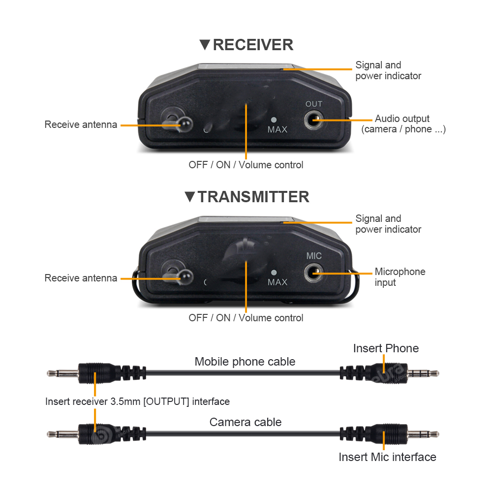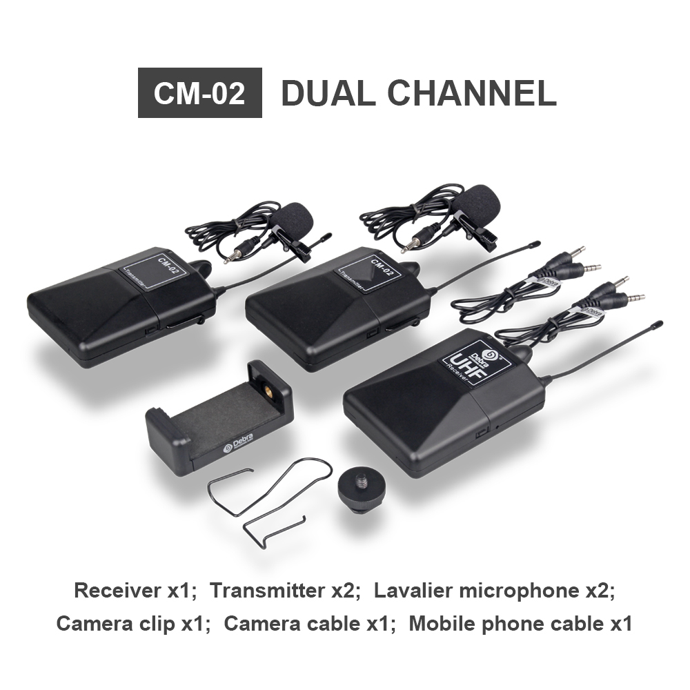 Transmitter × 1 Receiver × 1 Lavalier microphone × 1 monitor headset × 1 camera clip × 1 camera cable × 1 mobile phone cable × 1 manual × 1